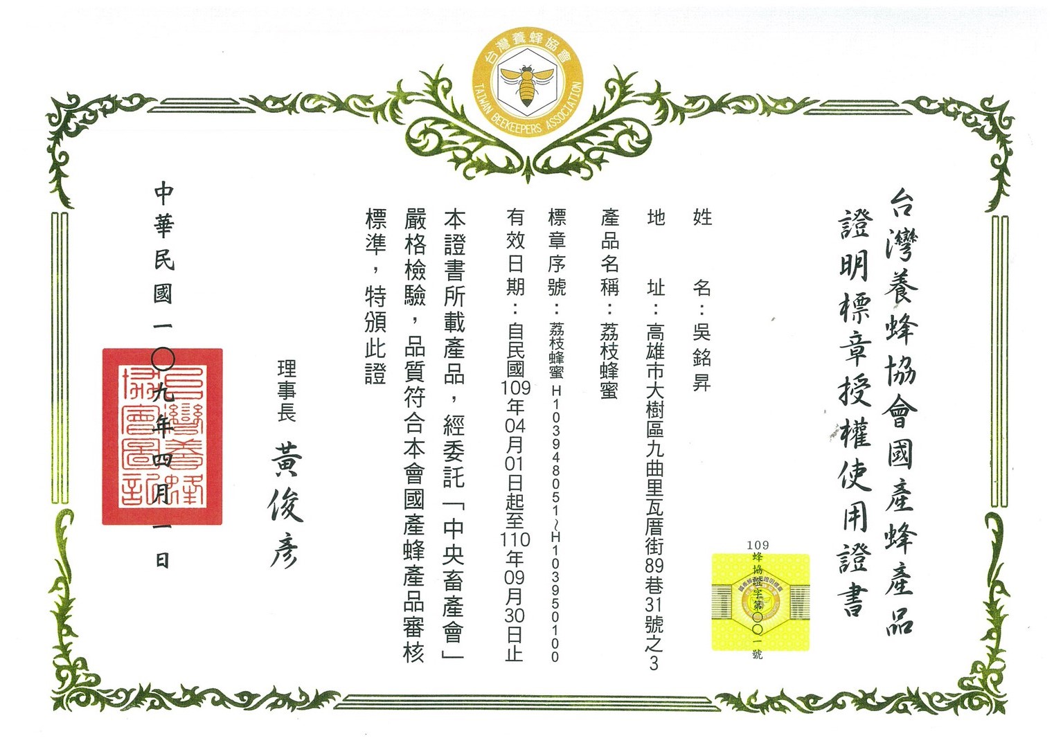 2020國產玉荷包蜂蜜認證標章